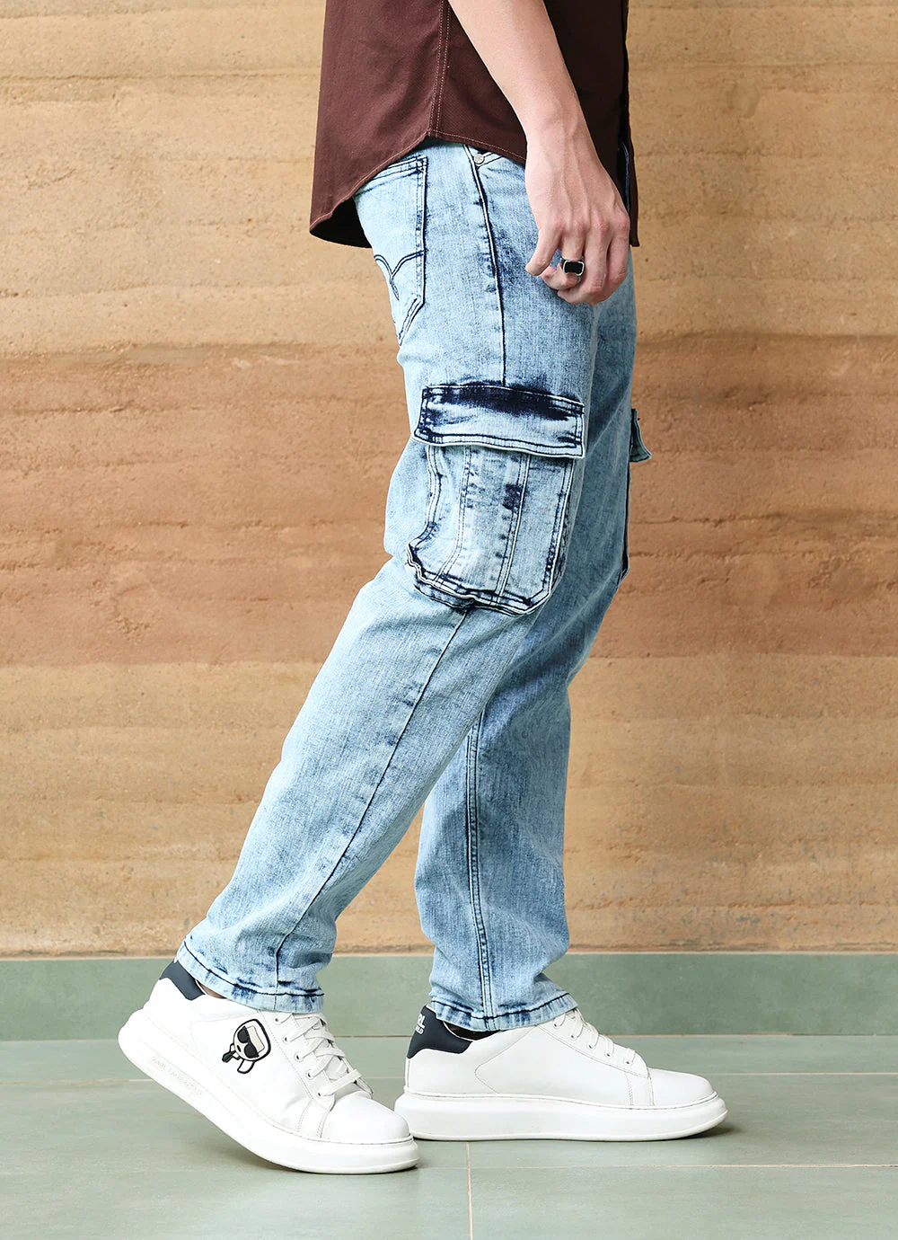 The Light Blue Faded Cross Hatch Cargo Fit Jeans combine rugged utility with modern street style. Featuring multiple side cargo pockets and a unique cross-hatch faded wash, these jeans are built for both function and fashion. The cargo fit ensures comfort and ease of movement while delivering an edgy, casual vibe.
